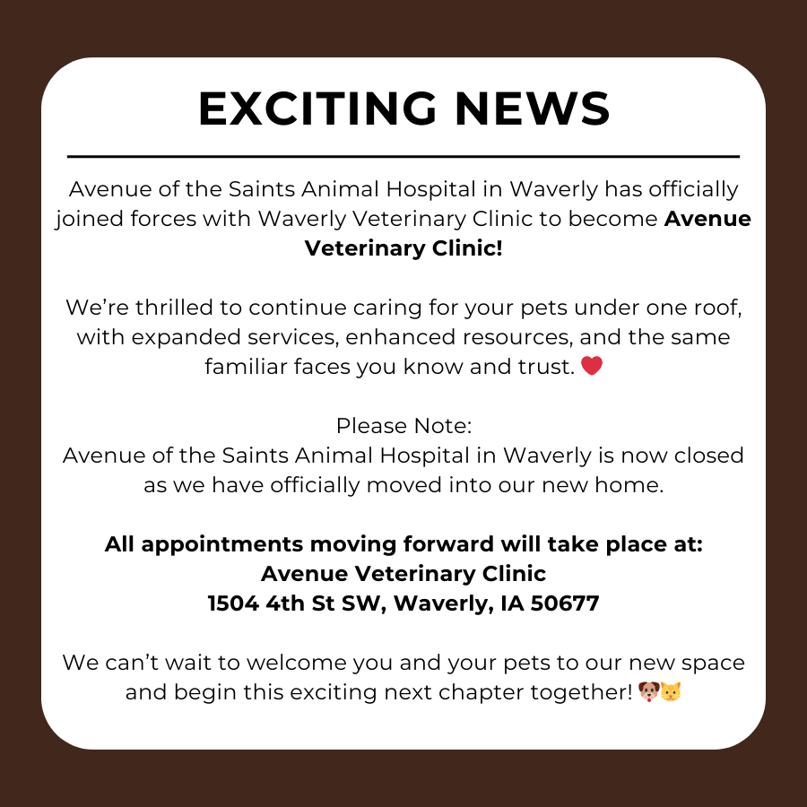 We’re excited to share that Avenue of the Saints Animal Hospital is joining forces with Waverly Veterinary Clinic to better serve you and your pets. Starting March 2, our combined team will welcome you at a new, more accessible location—just ½ mile down the road—under a new name: Avenue Veterinary Clinic. 📌 New Address: 1504 4th St SW, Waverly, IA 50677.